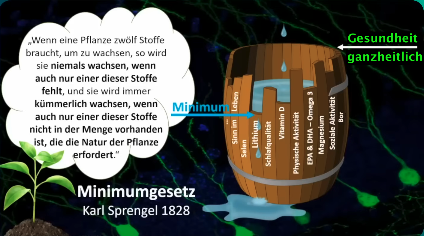 Bei der täglichen Nahrungsaufnahme, spaltet der Körper den Nahrungsbrei in Mikronährstoffe auf, die eine Vielzahl von lebenswichtigen, regulierenden Aufgaben haben. Gibt es einen Mangel an essenziellen Nährstoffen, wie z.B. Vitamin D, Omega-3, Eisen oder anderen, kann es zu Störungen in der Homöostase (= Selbstregualtion des Körpers) und in Folge zu Krankheits-Symptomen kommen. Hier wirkt das Minimum-Gesetz und das Maximum-Gesetz (wird anschliessend erklärt). Da in unseren heutigen Nahrungsmitteln, lebenswichtige Mikronährstoffe stark reduziert sind oder ganz fehlen, ist eine gezielte Nahrungs-Ergänzung mit qualitativ hochwertigen Supplementen mehr als sinnvoll. Auch eine vielseitige und biologische Ernährung kann den Nährstoffbedarf nicht decken, weil Böden ausgelaugt sind und Belastungen mit Umweltgiften bestehen (zunehmend auch in Bio-Lebensmitteln).